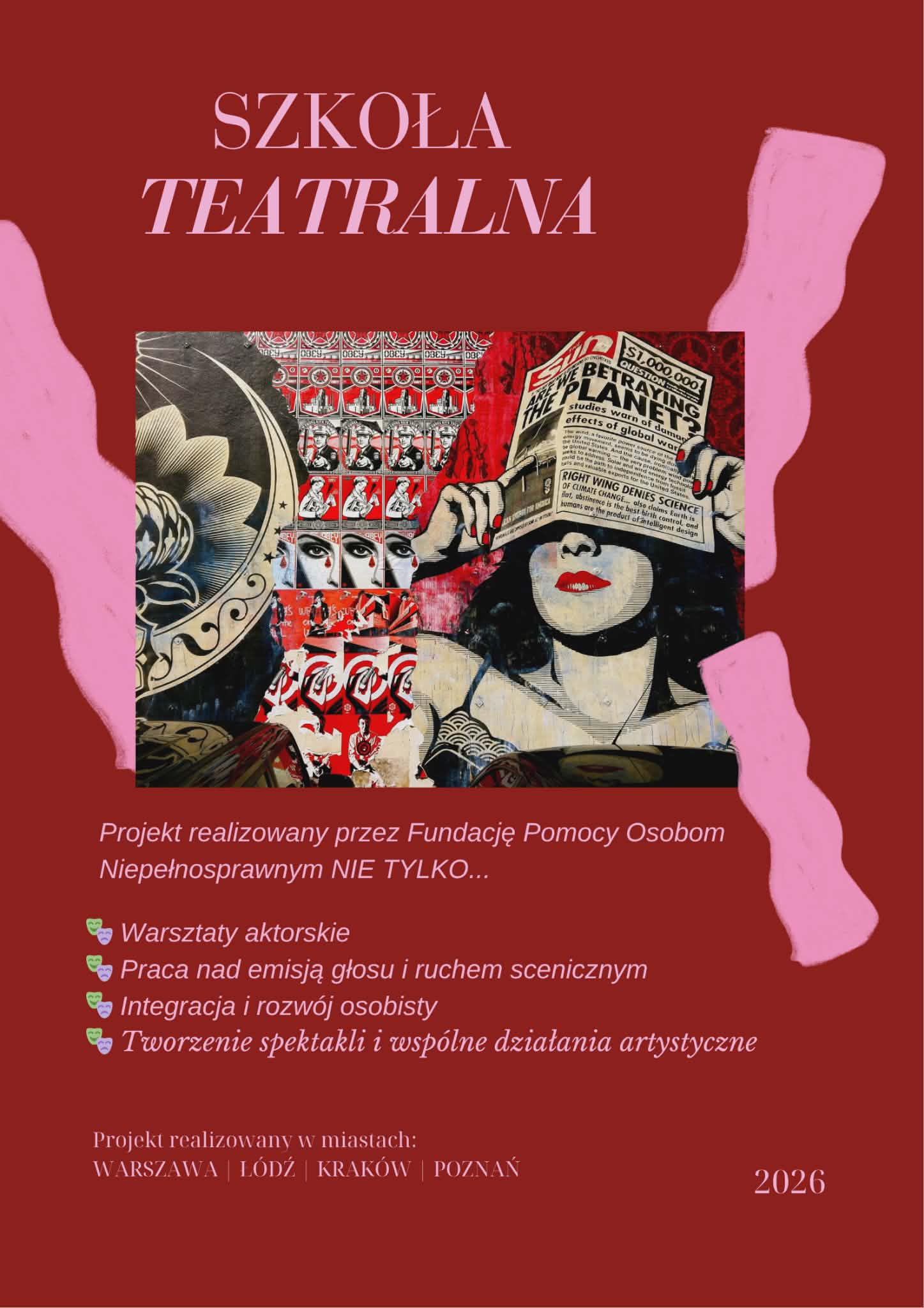 Od 1 stycznia do 31 grudnia 2026 roku Fundacja Pomocy Osobom Niepełnosprawnym „Nie Tylko…” z zaangażowaniem i energią realizuje kolejny projekt „Szkoła Teatralna 2026”. Inicjatywa skierowana jest do 80 osób z niepełnosprawnością intelektualną z Warszawy, Krakowa, Łodzi i Poznania.